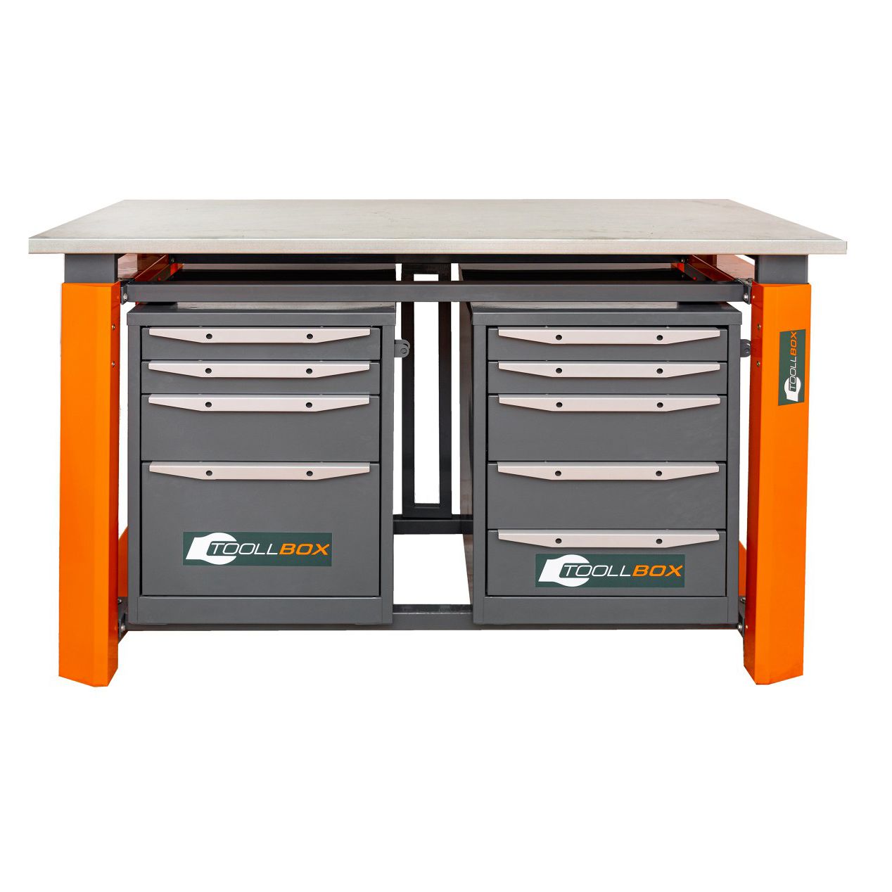 Одна тумба укомплектована 4 выдвижными ящиками, вторая — 5 ящиками. Такое разделение удобно, когда нужно разнести содержимое по логике задач: например, измерительный инструмент отдельно от крепежа, абразивов или электрики. Оба блока имеют петли для запирания на навесной замок — полезная деталь для мастерских, где важно ограничить доступ или просто закрыть ящики на время смены.