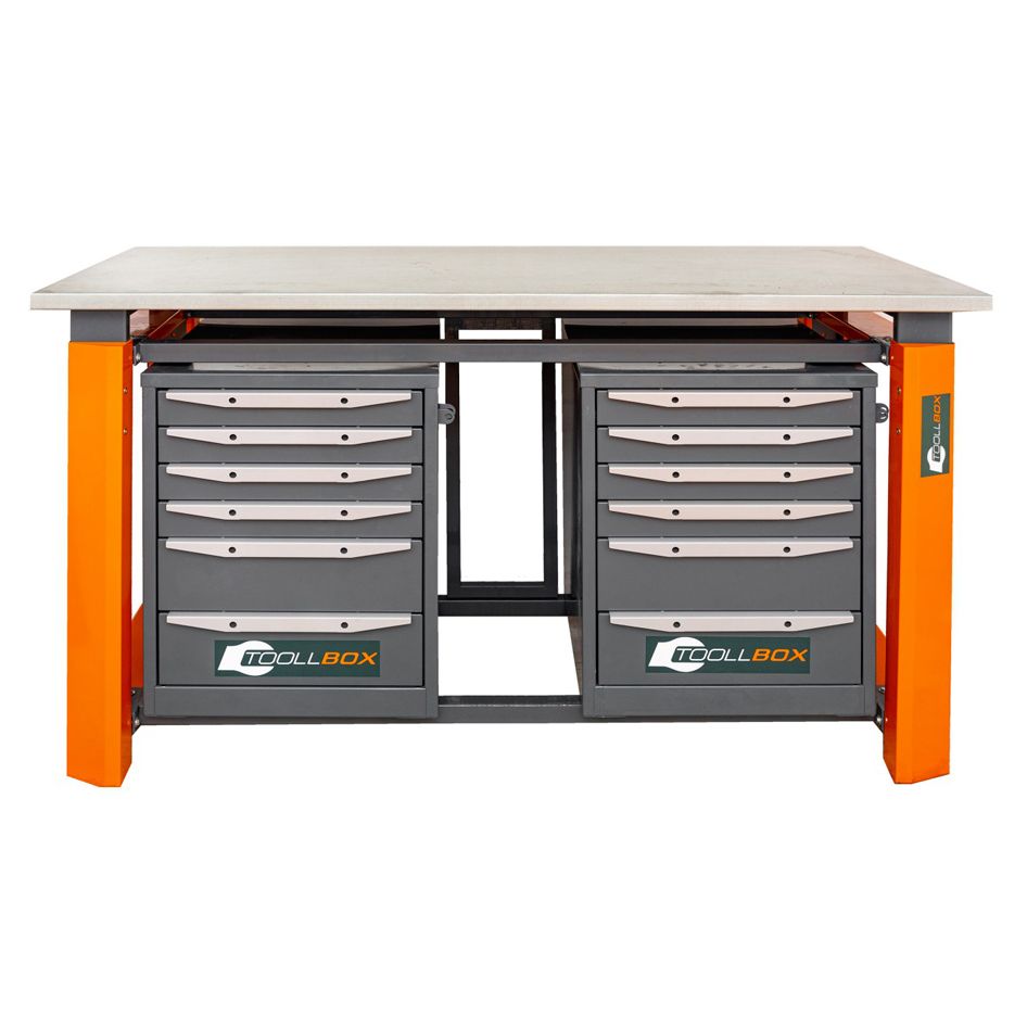 В комплектацию входят две тумбы ТВ6, каждая из которых оснащена шестью ящиками. Такое исполнение помогает грамотно организовать хранение, разделить инструмент по категориям и держать все нужное под рукой без лишнего беспорядка на рабочей поверхности. Верстак одинаково удобен там, где ценят порядок, быстрый доступ к содержимому и рациональное использование рабочего пространства.